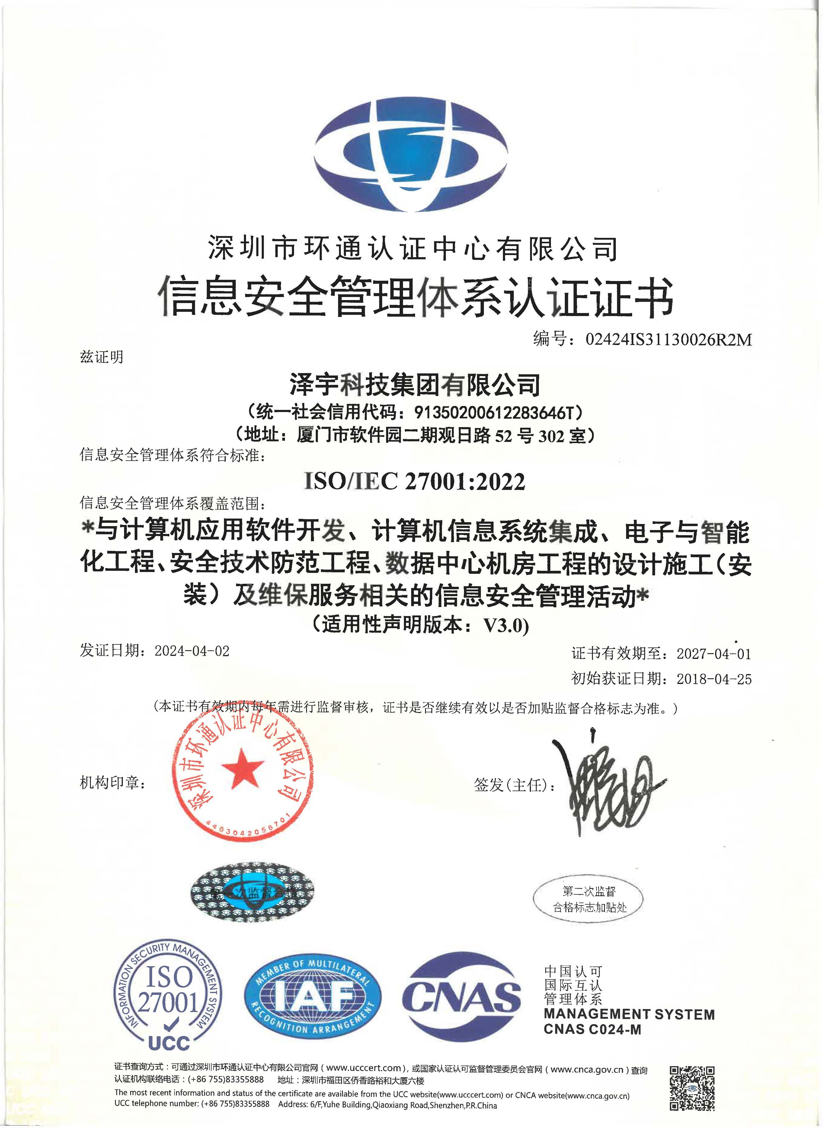 ABOUT US關于我們ABOUT US關于我們澤宇科技集團是一家集物聯網應用、系統集成、軟件開發及運維服務于一體的綜合性、科技型、專業技術服務型企業,同時也是廈門市首家專業從事數據中心建設的企業。 經過二十五年來的實踐和積累,擁有一支集設計咨詢、應用開發、項目實施管理和運維服務的高水平團隊,并取得相關行業、主管部門的認可和認證。 公司深耕數據中心建設及運維近三十年,通過技術積累、不斷創新,擁有兩個發明專利、二十余項實用新型及六十余項軟件著作權。 旗下子公司: 晟科信息技術有限公司 中聯偉業(廈門)科技有限公司 晟科教育裝備(惠安)有限公司 尚校云信息技術泉州有限公司 公司通過對“物聯網管理系統及方法”的專利技術的深度應用,研發了物聯網感知平臺(IOT平臺)及數據中臺,實現數據管理和應用孿生,完成對前端控制設備進行數據清洗及控制反推。 公司通過對“數據中心降溫方法”的專利技術,在數據中心節能方面進行應用和創新,形成了數據中心節能核心技術,取得了綠色數據中心建維5A級認證,并且我們也是綠色數據中心建維體系認證的參編單位。 以上2個核心專利技術的應用,主要在數據中心的安全、節能和便捷管理方向上,同時,我司也對2項專利技術應用方向,進行了深度融合,廣泛應用到智慧園區、智慧工廠、智慧醫療、智慧建筑、智慧農業、智慧校園等業務管理場景。 | NEWS新聞資訊NEWS新聞資訊